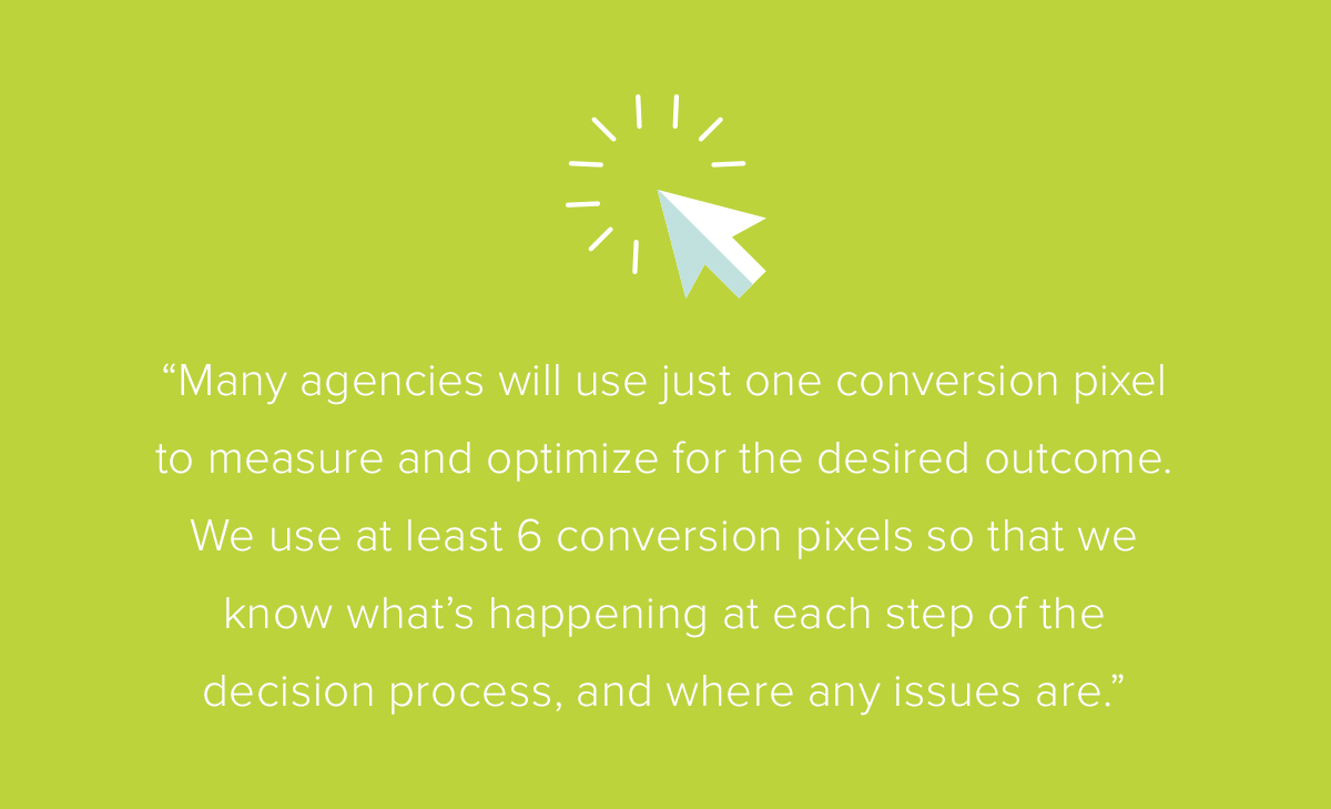 Also, since you set up online measurement and tracking for the purpose of reporting, and not the more-rigorous usage of agile testing, the data you get back won’t help you make granular marketing decisions. For example, many agencies will use just one conversion pixel to measure and optimize for the desired outcome. We use at least six conversion pixels so that we know what’s happening at each step of the decision process, and where any issues are.